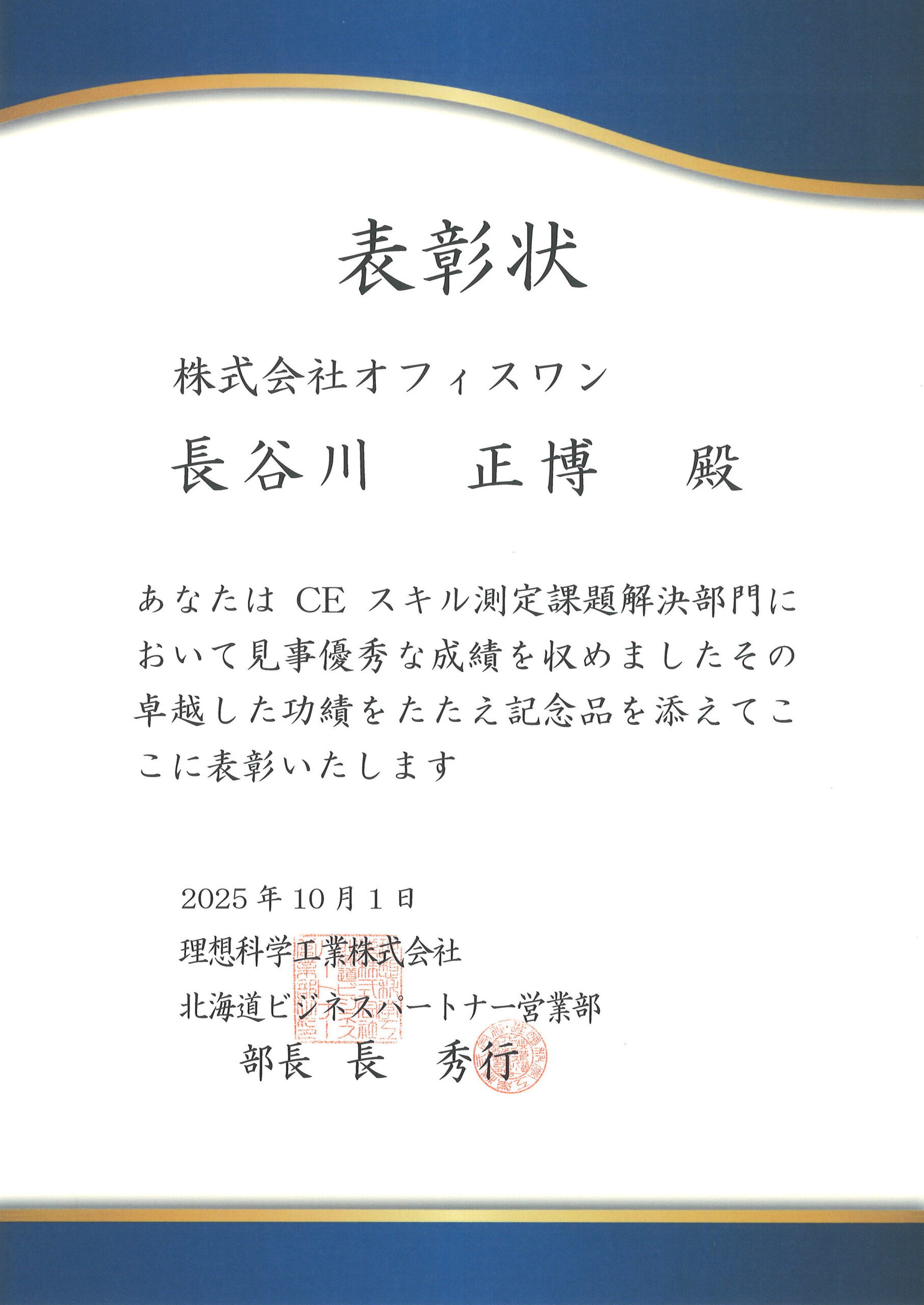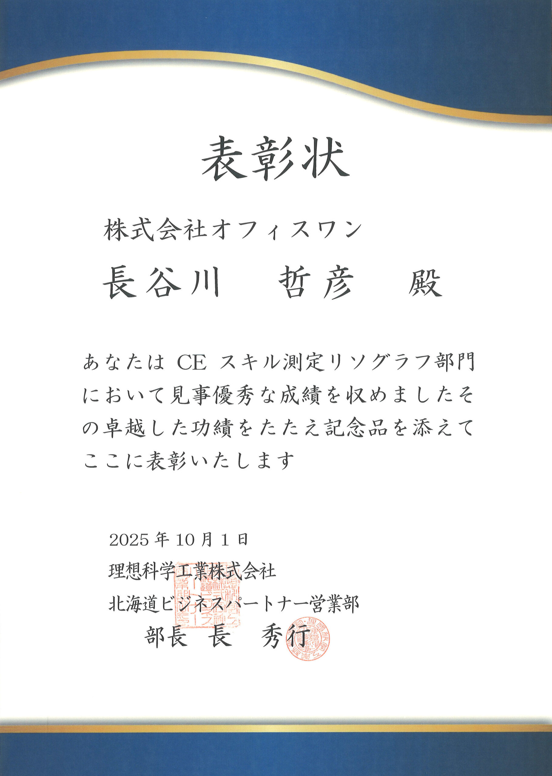理想科学工業株式会社 CEスキル測定 結果 2025.10.24 理想科学工業株式会社が実施したCEスキル測定において、 弊社技術部の部長 長谷川 正博君が「課題解決部門」で、 課長 長谷川 哲彦君が「リソグラフ部門」で、 それぞれ全道1位を獲得しました!! 社員研修実施に伴う臨時休業のお知らせ